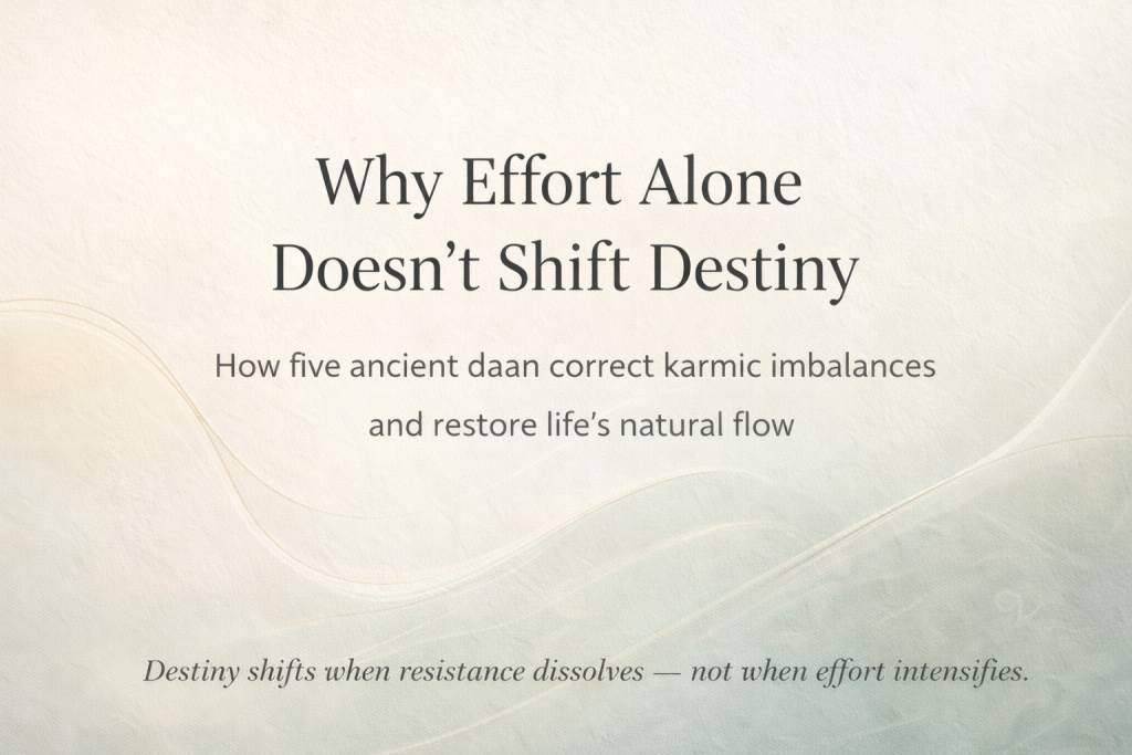 How Five Ancient Daan Correct Karmic Imbalances and Restore Life’s Natural Flow Destiny rarely shifts through effort alone.It changes when karmic imbalance is acknowledged and gently corrected. You can do everything right and still feel stuck.In the Vedic understanding of karma, effort moves energy forward — but imbalance holds it back.Daan works not by forcing […]