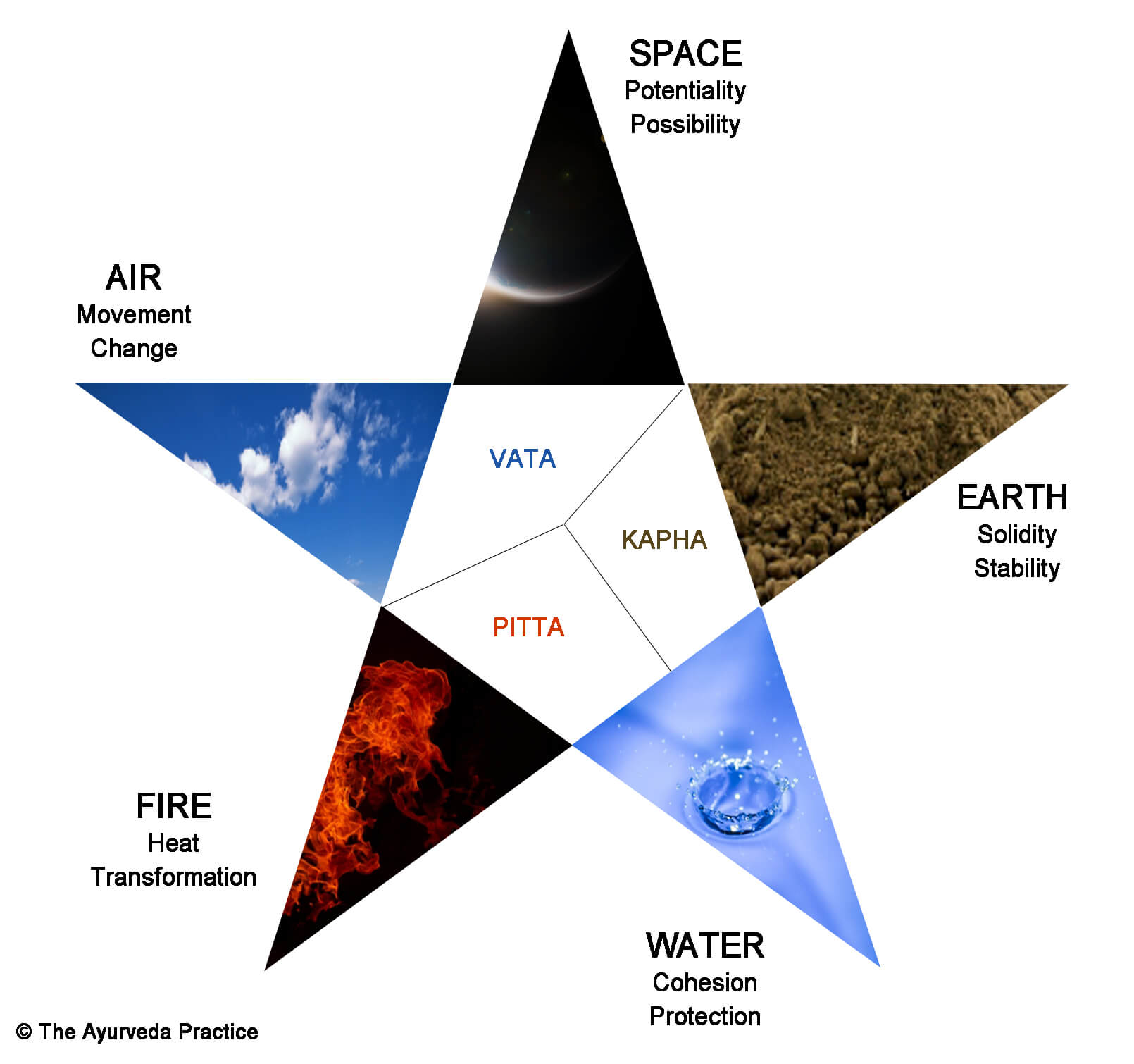 Doshas are derived from the five elements that form the building blocks of nature: Earth, Water, Fire, Air, and Ether (Space). The three doshas are combinations of these elements: